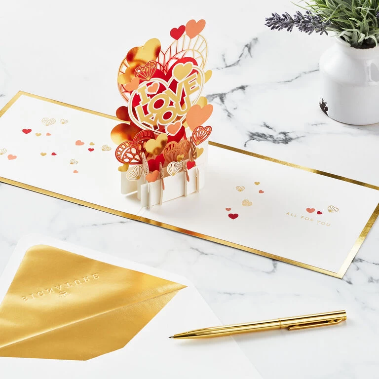 Pop-up love greeting card features hearts on a red background with gold foil accents paired with a loving message and a gold foil border on the front. Simply open the card to reveal the 3D pop-up surprise inside—no assembly required: an intricate, laser-cut scene of red, pink and gold hearts paired with an “I love you” message pops out. Gold foil accents add a sweet finishing touch to the inside of the card. This romantic greeting crafted from premium card stock is a work of art sure to be displayed all year long, making it an unforgettable way to celebrate your anniversary, Valentine’s Day or other special occasion. When open, card lays flat for display; 3D pop-up inside measures approx. 5.5″ H.