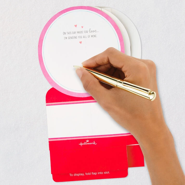 Pop-up Valentine’s Day greeting card features a laser-cut, dimensional scene of a “Love You” sign with hearts inside of a 3D molded plastic snow globe-style design. Musical card plays a cheerful instrumental tune while confetti blows inside when button on front is pressed. Simply unfold the card to create a fun surprise—no assembly required—that can be displayed on any tabletop. When open for display, 3D pop-up card measures approx. 7.13″ H.