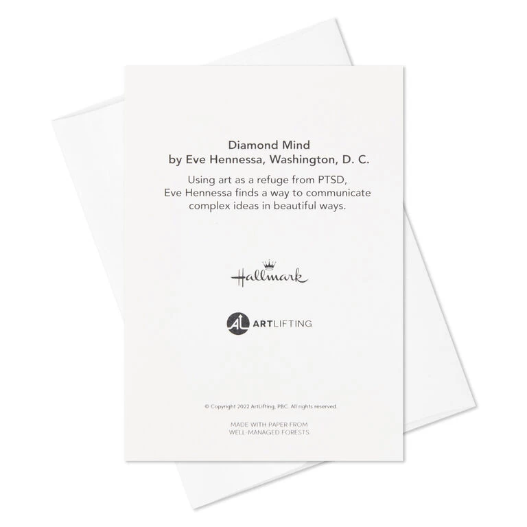 Colorful geometric design, on back: Diamond Mind by Eve Hennessa, Washington, D.C. Using art as a refuge from PTSD, Eve Hennessa finds a way to communicate complex ideas in beautiful ways.