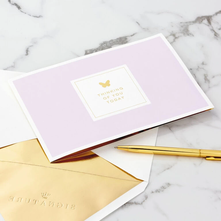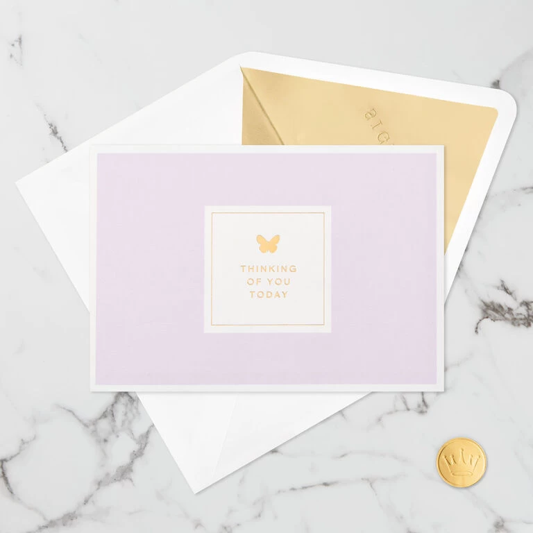 Pop-up thinking of you greeting card features a metallic gold foil butterfly and “thinking of you today” message on the front. Simply open the card to reveal the 3D pop-up surprise inside—no assembly required: intricate layers of laser-cut butterflies and flowers accented with sparkly glitter and shimmering gold foil pop out. This beautiful card crafted from premium card stock is a work of art sure to be displayed all year long, making it an unforgettable way to celebrate her birthday or Mother’s Day, or just to let a special friend know how much she’s appreciated—today and always. When open, this pop-up card lays flat for display; 3D pop-up inside measures approx. 6″ H.