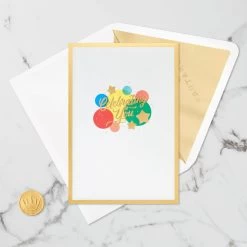 Pop-up birthday greeting card features colorful circles and stars paired with a celebratory message and gold foil border on the front. Simply open the card to reveal the 3D pop-up surprise inside—no assembly required: an intricate, laser-cut scene featuring a red truck and a colorful banner and decorations pops out. Gold foil accents add a shiny and shimmery touch to the inside of the card. This festive greeting crafted from premium card stock is a work of art sure to be displayed, making it an unforgettable way to share birthday wishes with someone special. When open, card lays flat for display; 3D pop-up inside measures approx. 4.25″ H.