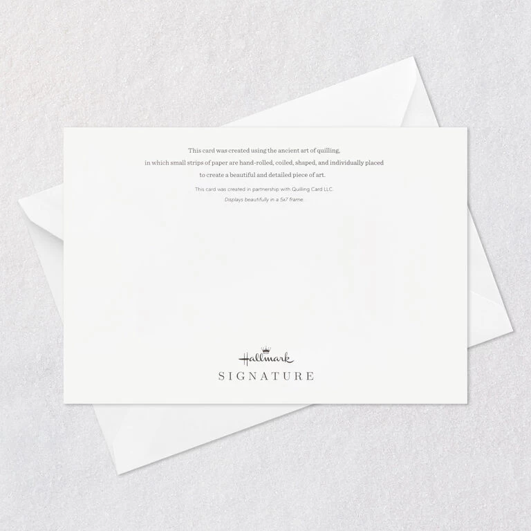 Birthday greeting card features a “Happy” message and colorful floral design made of intricate quilled paper. Greeting is a work of art that displays beautifully in a 5×7 frame (sold separately), making it an unforgettable way to share happy birthday wishes. Crafted using the ancient art of quilling, in which small strips of paper are hand-rolled, coiled, shaped and individually placed to create a beautiful and detailed piece of art, this Hallmark Signature card was designed in collaboration with Quilling Card LLC, a company seeking to promote the art of paper quilling.