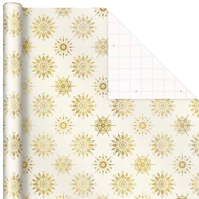 - Pack includes 6 wrapping paper rolls in assorted gold designs: gold lettering on white, gold snowflakes on cream, gold stars on white, gradient stripes, ombré dots on cream and monochrome stripes.