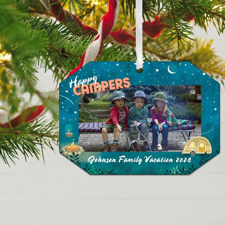 Commemorate a fun camping trip with this personalized metal Christmas tree ornament. Choose a memorable photo to showcase with the frame design that features a cute nighttime camping scene, then customize it with the year and name, or a personal message. Makes a great memento or a thoughtful gift for family or friends who shared in the adventure.