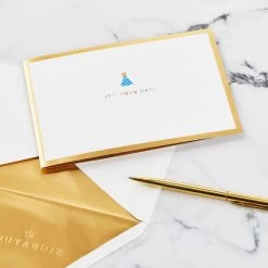 Pop-up birthday greeting card features a party hat with gold foil accents paired with a celebratory message and gold foil border on the front. Simply open the card to reveal the 3D pop-up surprise inside—no assembly required: an intricate, laser-cut scene of a cute puppy dog sitting inside of a present with colorful balloons, a “happy birthday” banner and other gift packages pops out. Gold foil accents add a festive touch to the inside of the card. This fun greeting crafted from premium card stock is a work of art sure to be displayed all year long, making it an unforgettable way to share happy birthday wishes with kids, friends or family members. When open, card lays flat for display; 3D pop-up inside measures approx. 5.5″ H.