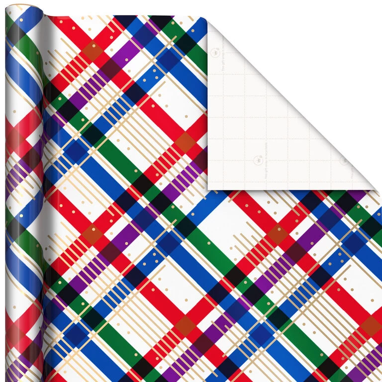 - Pack includes 3 wrapping paper rolls in assorted holiday designs with gold ink accents: patterned trees on royal blue, multicolor plaid on white and snowflakes on purple.
