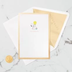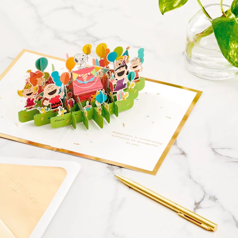 Pop-up birthday greeting card features a smiling Snoopy with a cupcake and balloon paired with a “celebrate” message and border in gold foil. Simply open the card to reveal the 3D pop-up surprise inside—no assembly required: an intricate, laser-cut birthday party scene pops out featuring Snoopy atop his doghouse surrounded by Charlie Brown, Lucy, Linus, Sally, Woodstock and other members of the Peanuts Gang. Die-cut balloons, presents, pennant banner and confetti with foil accents add to the fun. This exquisite card crafted from premium card stock is a work of art sure to be displayed all year long, making it an unforgettable way to share happy birthday wishes with kids, friends, family members or any Peanuts fan. When open, this pop-up card lays flat for display; 3D pop-up inside measures approx. 3.25″ H.