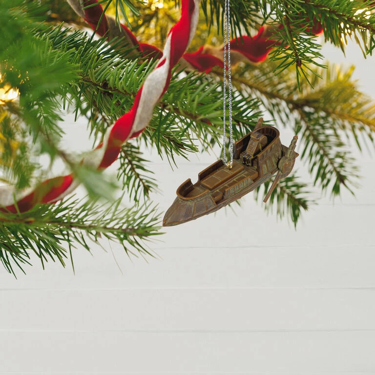 Durable and well-suited for desert terrain, the Bantha-II cargo skiff served as a perfect means for the Hutt Syndicate to transport passengers and cargo throughout Tatooine. Relive the action from Star Wars: Return of the Jedi with this Christmas tree ornament that features the iconic repulsor-based vehicle, in which Jabba the Hutt sent Han Solo, Luke Skywalker and Chewbacca into the Great Pit of Carkoon.