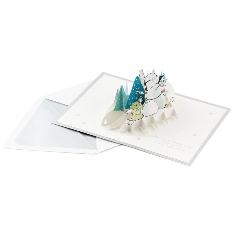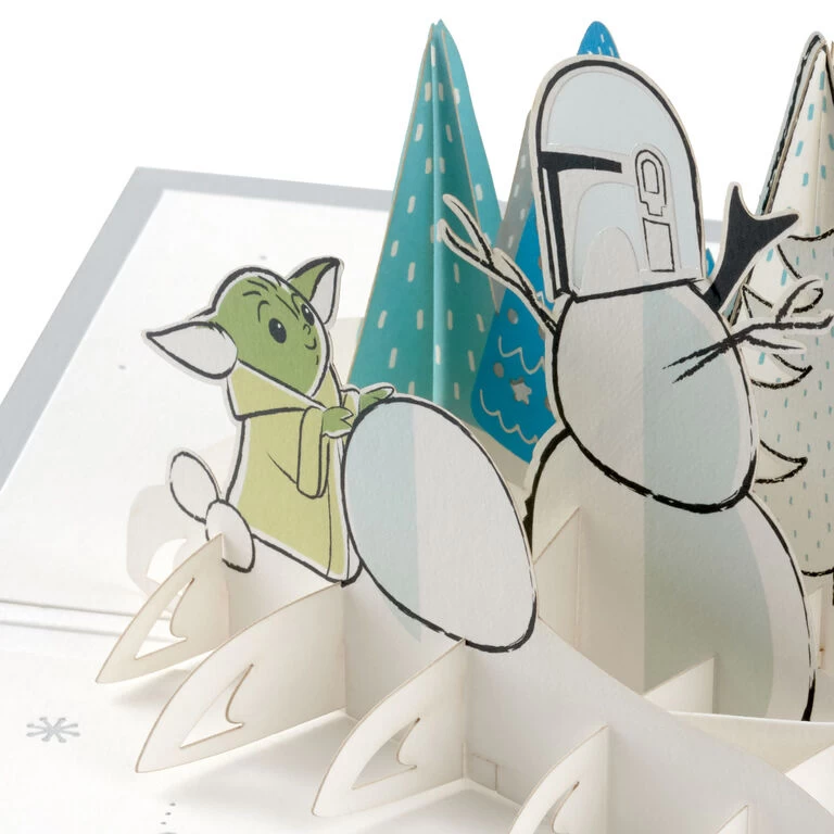 Pop-up holiday greeting card features an illustration of the mysterious Force-sensitive child Grogu from Star Wars: The Mandalorian and shiny silver foil accents on the front. Open the card to reveal the 3D pop-up surprise inside—no assembly required: an intricate, laser-cut scene of Grogu offering snowballs to a snowman version of the Mandalorian, Din Djarin, pops out. Die-cut trees and foil snowflakes add to the fun. This charming card crafted from premium card stock is a work of art sure to be displayed all year long, making it an unforgettable way to share happy holiday wishes with friends, family and fans of the Disney+ original series.